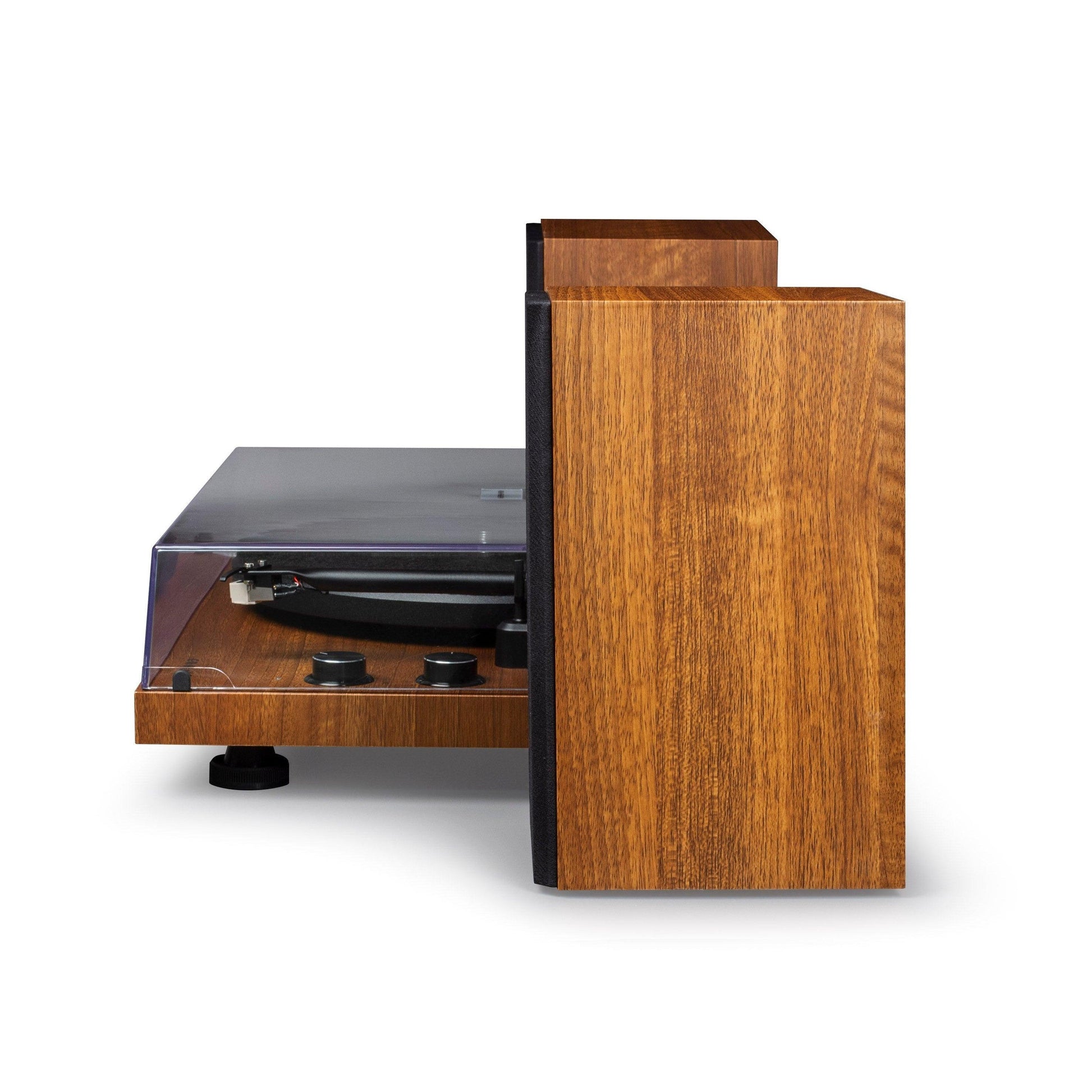 The Crosley C62 in Walnut was designed to be a ready-to-go-sounds-darn-good-straight-out-of-the-box turntable system that doesn’t break the bank. This fully manual two-speed (33 1/3 & 45 RPM) turntable sports an MDF plinth wrapped in a faux walnut veneer that would fool the best of lumberjacks. The matching MDF speakers look just as good as the turntable and each rock a mid-range speaker and tweeter. The matte black aluminum tonearm has an adjustable counterweight and comes pre-mounted with a moving magnet cartridge. Of course, the cartridge is mounted with the standard 1/2” mount, so you can always upgrade your cartridge/stylus combo as your vinyl collection grows. The record sits on a heavy steel platter that helps keep the C62 firmly planted on its three vibration control feet. Take that, rouge vibrations! The super minimal, two-knob design makes it easy to switch speeds, crank up the volume, and switch to the built-in Bluetooth receiver if you want to stream music from your favorite digital playlist. Whether you live in a sweet NYC loft or a teenage bedroom filled with angst, the C62 can hold its own.